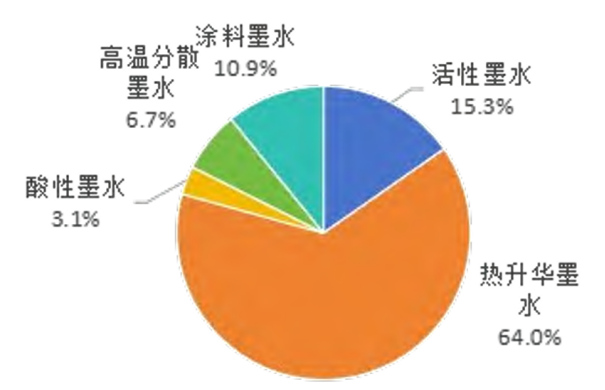 中國市場上數碼噴墨印花墨水主要是分散(含轉印和直噴)墨水、活性墨水、酸性墨水和涂料墨水。據統計截止到2023年,目前市場上分散墨水約占70.7 %(其中64%為用于轉印的熱升華墨水,6.7%為用于直噴的高溫分散墨水),活性墨水約占15.3%,顏料墨水約占10.9%,酸性墨水約占3.1%。