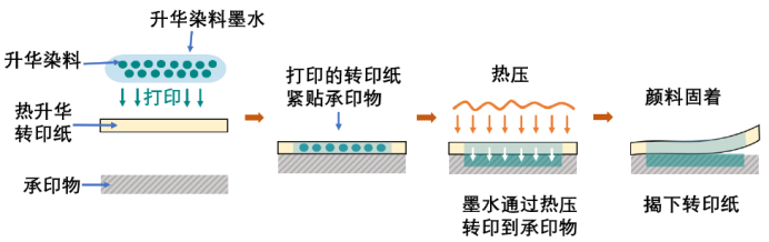 分散染料墨水與轉移印花紙結合的熱轉印技術,是目前數碼噴墨印花最主流、最成熟的方式。熱升華轉印工藝,是在印花機上將圖案打印到涂有涂層的轉印紙上,再通過熱轉印機(高溫高壓)將圖案轉移到滌綸織物上。