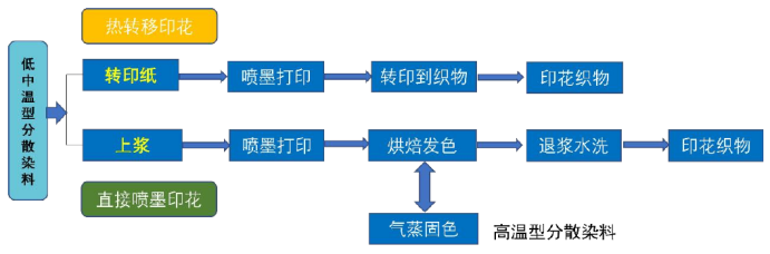 直接噴墨印花工藝,將分散染料墨水直接噴印到經過預處理的滌綸織物上,然后進行汽蒸固色和水洗。