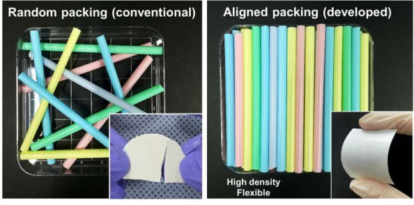 左圖所示的傳統BNNT薄膜(由隨機排列的BNNT制成)密度較低,導致薄膜易碎。相比之下,右圖所示的新型BNNT液晶基薄膜中,納米管呈有序排列,密度更高,從而能夠制備出柔韌耐用的薄膜。